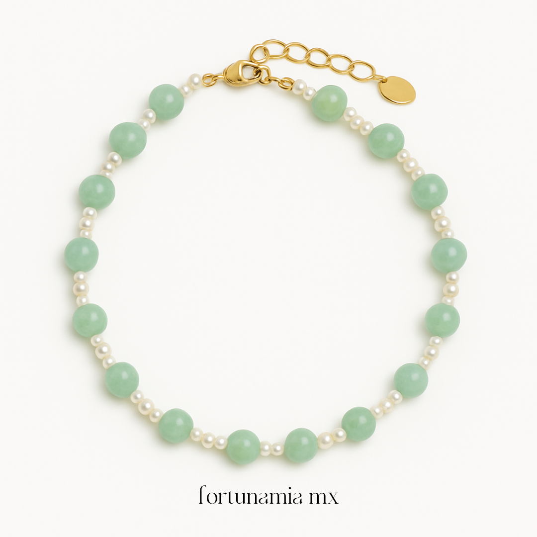 Pulsera de perlas con cuentas de aventurina, un amuleto de buena suerte, fortuna y protección.