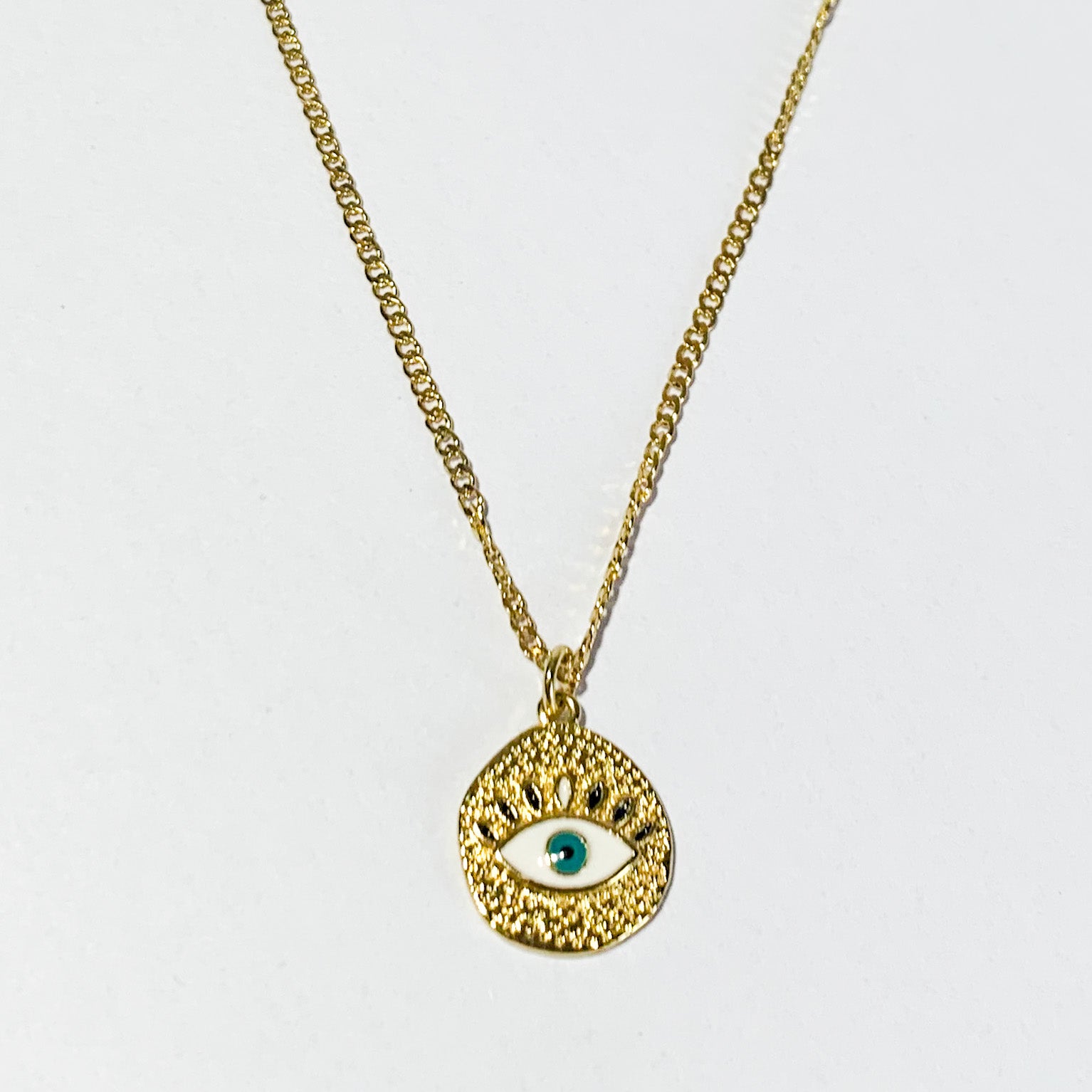 Te va encantar este collar de eslabones dorados, delicado y brillante, cuenta con un dije colgante en forma de moneda texturizada con ojo de la buena suerte.