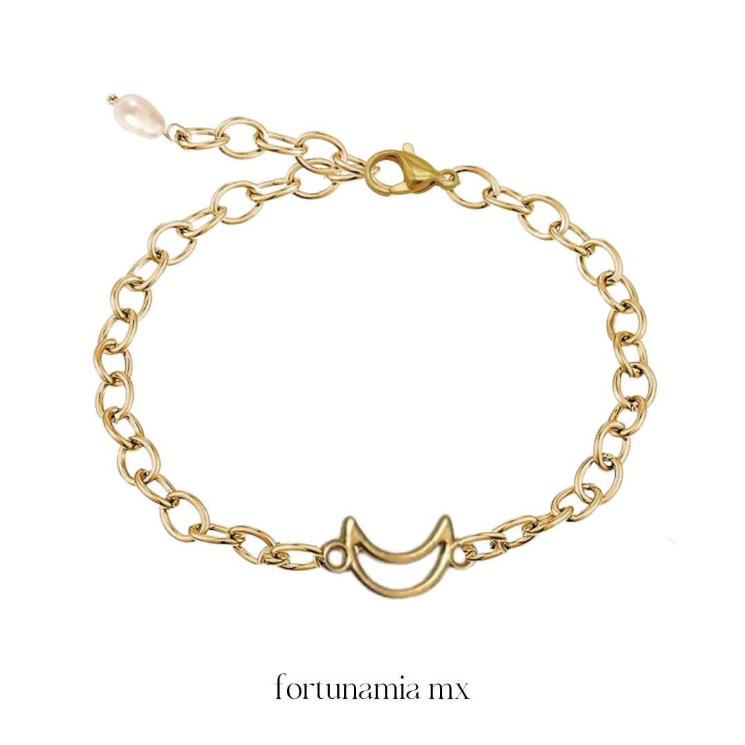 Esta delicada pulsera de eslabones dorados cuenta con un elegante dije en forma de media luna incrustado, complementado por una pequeña perla en la extensión. Fabricada en acero inoxidable con chapa de oro, esta pieza es el accesorio perfecto para añadir un toque sutil y sofisticado a cualquier outfit. 🌙✨